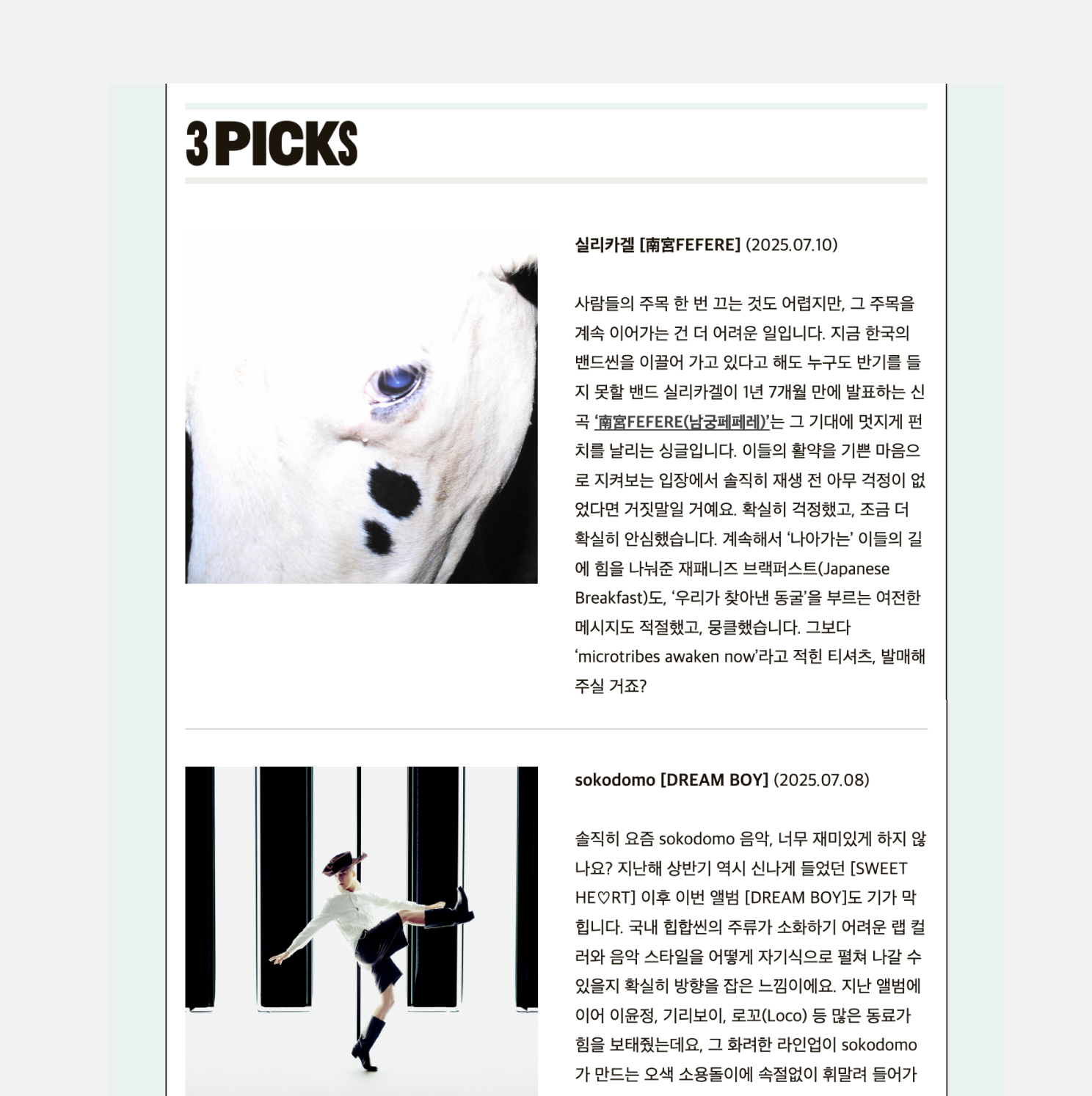 만약 소개하는 콘텐츠 각각의 무게가 비슷하다면 [2단 레이아웃]을 활용하는 방법도 있습니다. 예를 들어 <PICKSERVICE>처럼 ‘이번주에 주목할 만한 3가지 신곡’을 전할 때는 각 콘텐츠에 동일한 시각적 무게를 주는 카드형 레이아웃을 활용해 보세요. 혹은 가장 중요한 하나의 콘텐츠를 메인으로 하고 나머지는 보조 정보일 경우, [1단 레이아웃]을 활용한 상단 메인 영역과 [2단 레이아웃]을 활용한 하단의 보조 영역으로 구분하는 것도 좋습니다.