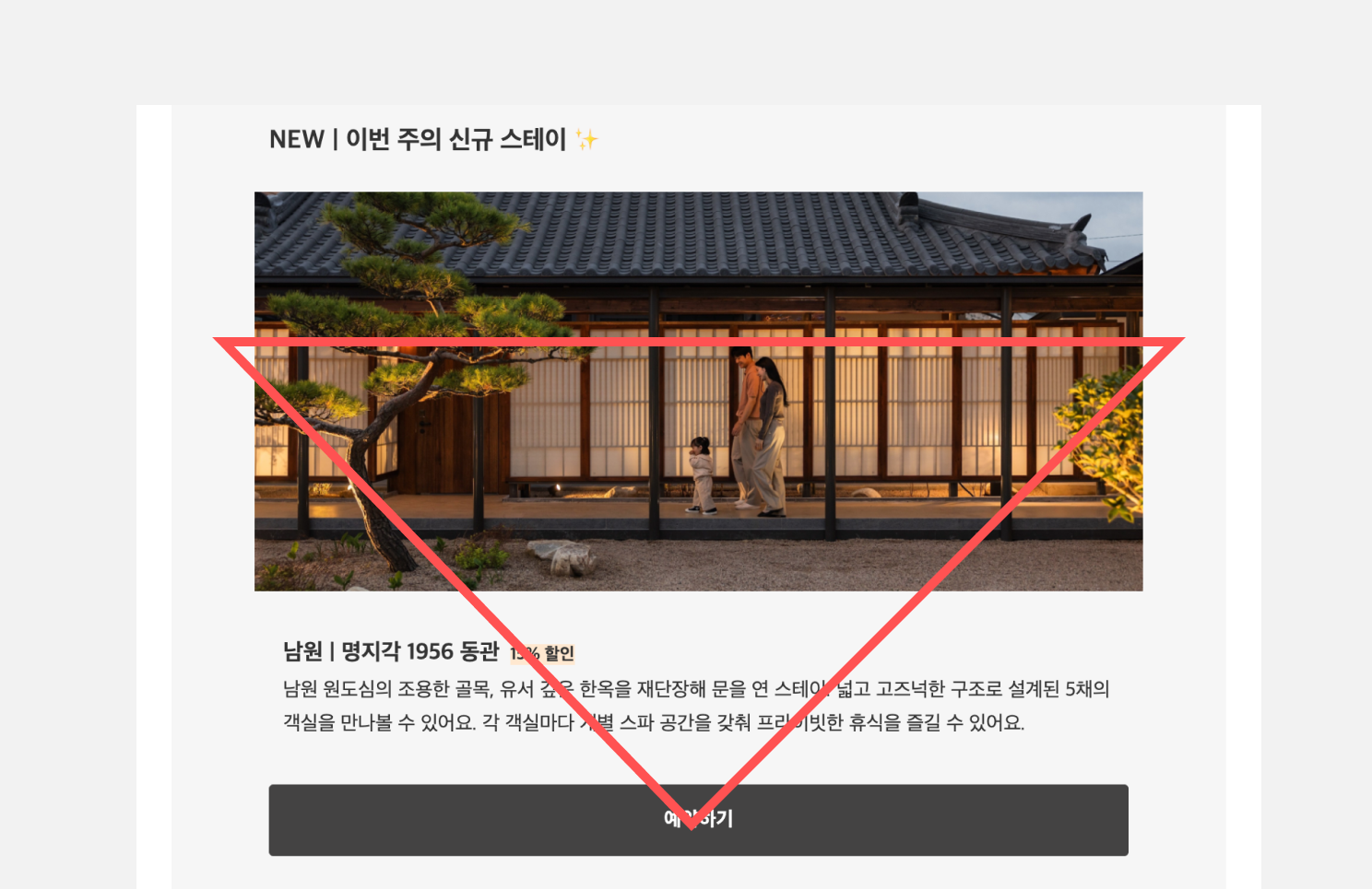 뉴스레터 콘텐츠를 전하는 것에서 나아가 구매, 리드 제출과 같은 특정 목표를 가지고 구독자의 행동을 유도하고 싶다면 레이아웃 디자인 구조에서도 이를 반영하는 것이 중요합니다. 그리고 이때는 CTA를 강조한 역삼각형 구조를 활용하는 것이 효율적이고요. 역삼각형 구조란, 상단에서 이미지와 텍스트 정보로 주의를 끌고 하단에 CTA 버튼을 강조해 시선이 CTA 버튼으로 집중되도록 설계한 구조입니다. 특히 상품을 소개하는 카탈로그 이메일에서는 역삼각형 구조를 반복되는 구조로 레이아웃을 디자인해서 구독자가 언제든 원하는 상품의 랜딩페이지를 방문할 수 있도록 도울 수 있습니다.