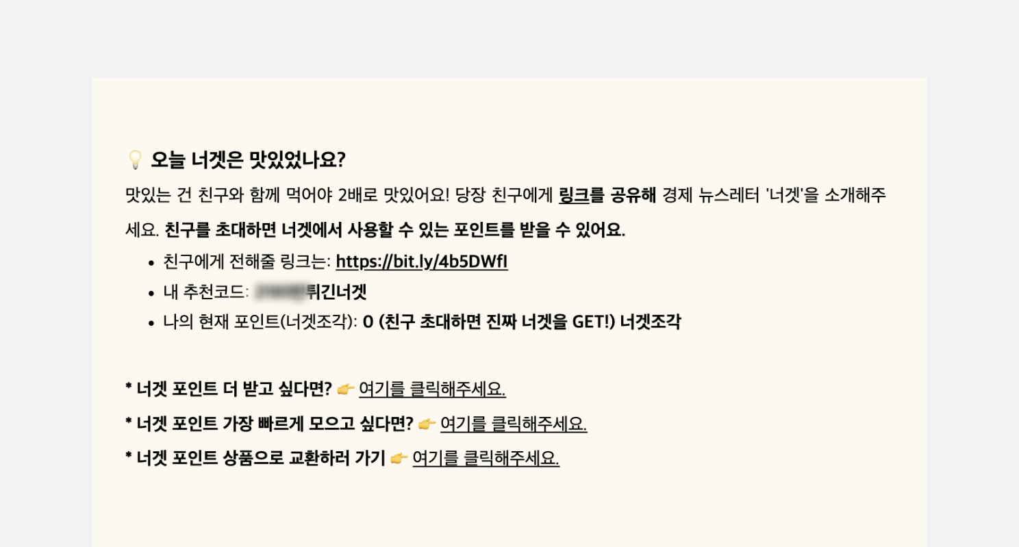 <너겟레터>는 좋은 콘텐츠를 더 많은 구독자들에게 닿게 하기 위해 추천인 제도를 활용합니다. 구독자가 더 많은 친구에게 뉴스레터를 소개할 수록 '너겟조각' 포인트가 쌓이고 포인트는 상품으로 교환할 수 있습니다. 구독자들이 주변에 뉴스레터를 소개하는 보람과 재미를 함께 느낄 수 있도록 구독 경험을 설계한 것입니다.
