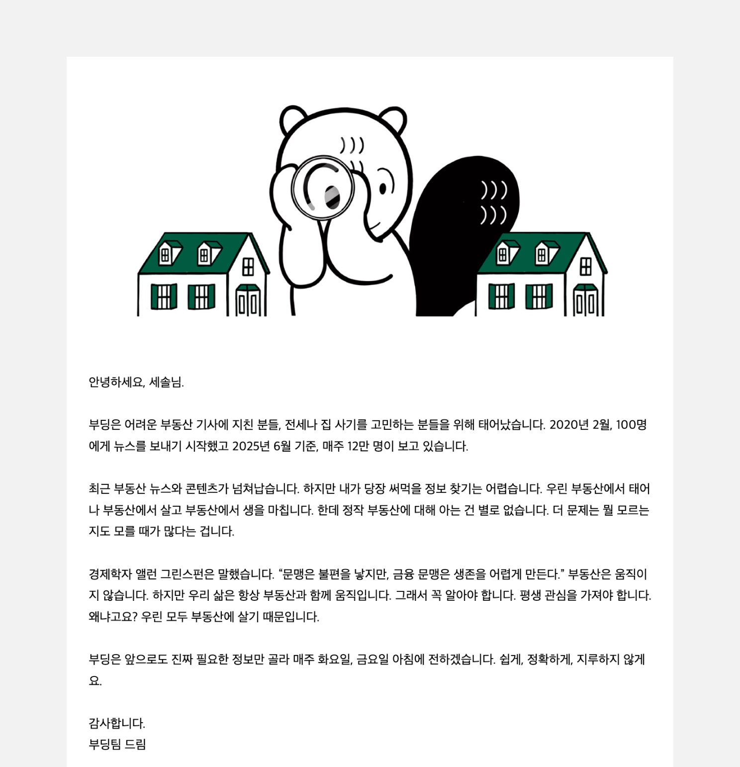 밀레니얼을 위한 부동산 뉴스레터 <부딩>입니다. 멀고 막연하게만 느껴지는 부동산 뉴스를 필요한 정보만 정리해 쉬운 언어로 전달합니다.