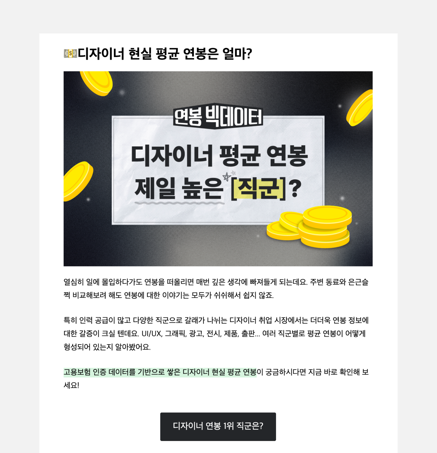 <컴퍼니타임스 레터>는 잡플래닛 홈페이지의 콘텐츠 중 큐레이션 된 아티클의 일부를 뉴스레터에서 소개합니다. 그리고 CTA를 배치하여 전문을 읽고 싶은 구독자는 자연스럽게 홈페이지로 유입될 수 있도록 구성해 두었습니다. 구독자들이 매번 홈페이지에 접속해 콘텐츠를 소비하기 어렵다는 점에 주목해, 뉴스레터를 구독자와 플랫폼 사이의 연결 매체로 활용하고 있습니다.