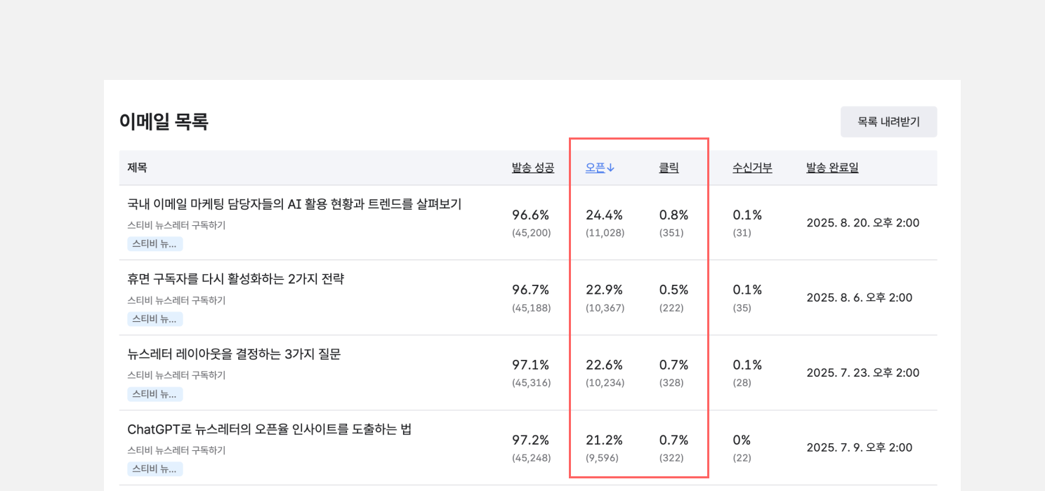 좋은 키워드를 발견하기 위해서, 검색엔진에서의 검색량을 조사하는 방식과 함께 뉴스레터의 성과 데이터를 활용해 보세요. 오픈율, 클릭률과 같은 구독자 참여 지표는 구독자들이 실제로 어떤 주제에 관심을 갖고 있는지 파악할 수 있는 중요한 지표입니다. 때문에 구독자 참여도가 높은 콘텐츠의 주제는 뉴스레터의 핵심 키워드가 될 가능성이 높습니다.