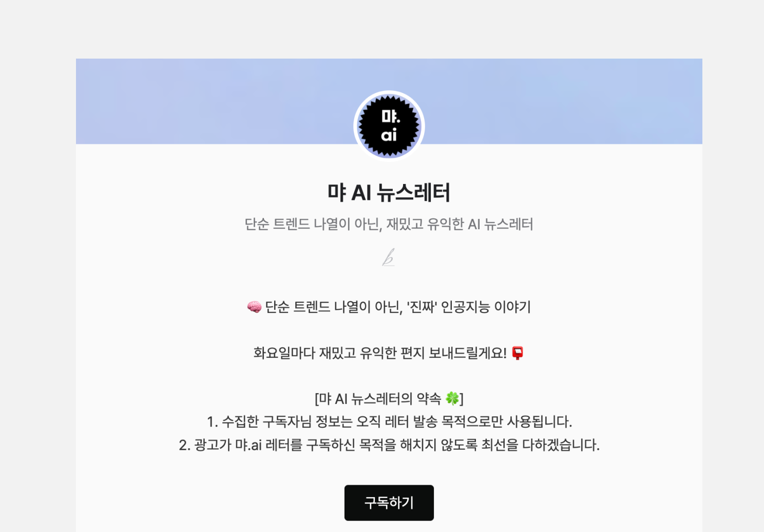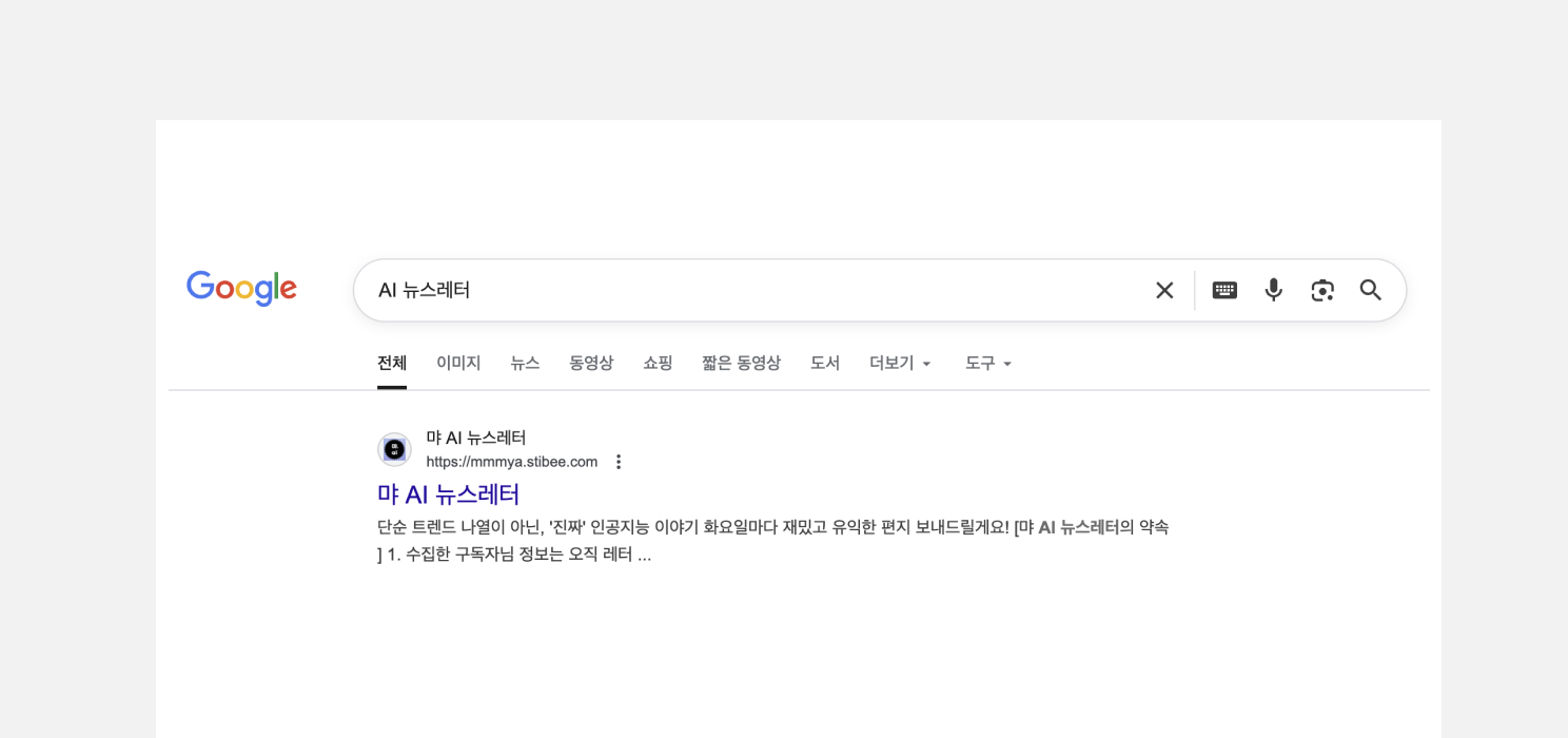 예를 들어 'AI 뉴스레터'라는 키워드를 검색하면 상단에 노출되는 <먀 AI 뉴스레터>는 뉴스레터 이름뿐만 아니라 이메일의 제목, 미리보기 텍스트, 본문, 공유 정보 등에 'AI'라는 키워드를 적극적으로 활용합니다. 뉴스레터 발행 초기부터 콘텐츠 곳곳에 자연스러운 방식으로 키워드를 반복 사용했기 때문에 'AI 뉴스레터'라는 키워드를 선점할 수 있었습니다.