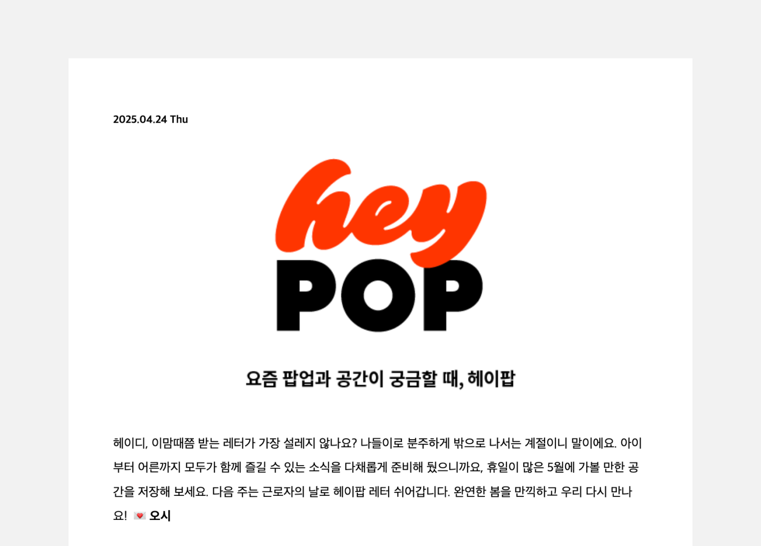 <헤이팝 레터>에서는 하나의 프로젝트를 깊이 있게 다룰 때 한 회차 전체를 활용하고 '프로젝트 캐비닛'이라는 별도의 코너로 소개합니다. 반면, 빠르게 다양한 정보를 접하는 것이 중요한 트렌드나 팝업 소식 등은 단신 형태로 간결하게 전하고, 자세한 내용은 홈페이지 링크를 통해 확인할 수 있도록 안내합니다. 콘텐츠의 성격에 따라 뉴스레터 코너를 구분해 깊이와 효율성을 모두 잡은 것입니다.