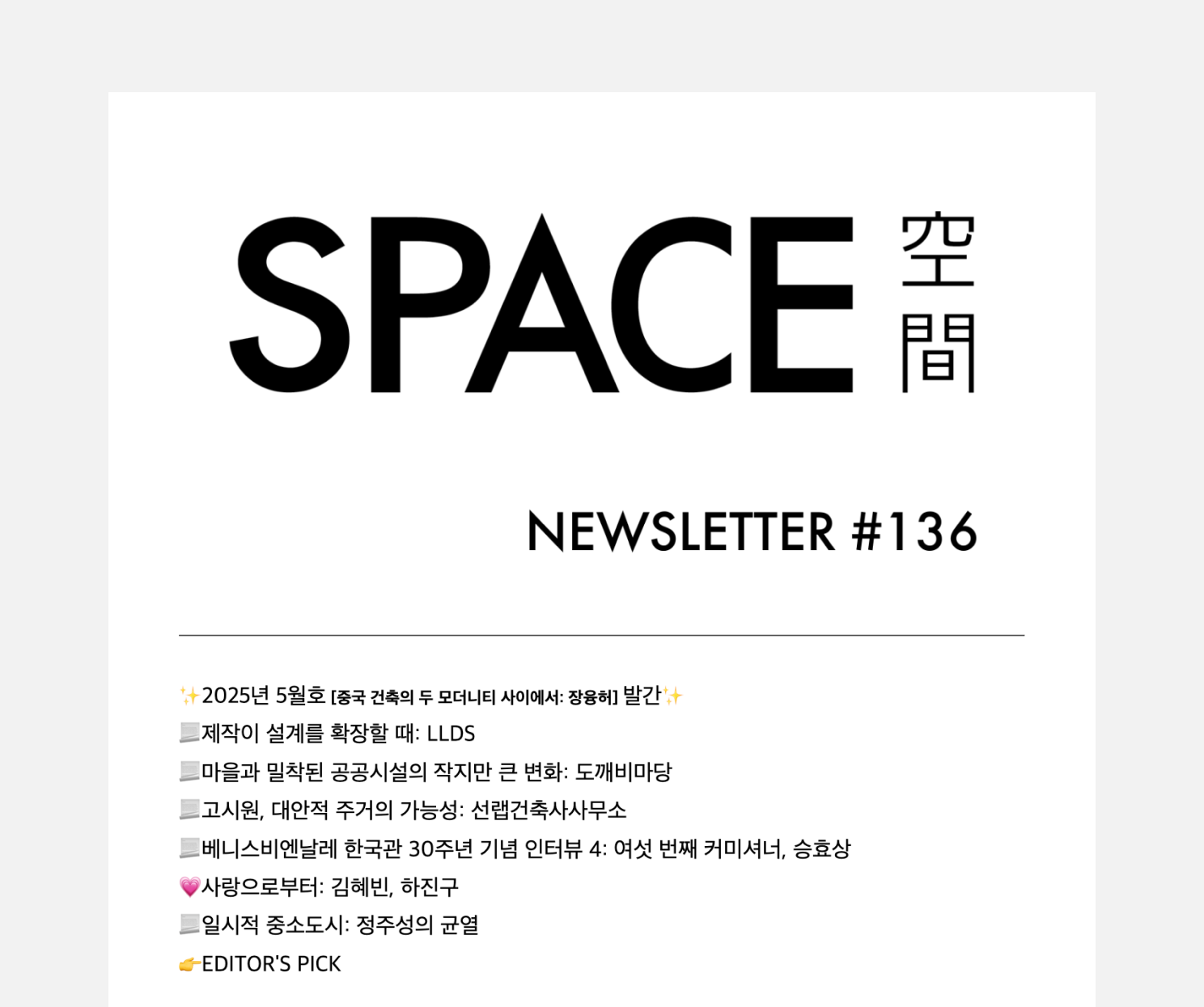 매달 두 번, 건축 잡지 '월간 SPACE'의 편집부가 발행하는 <SPACE 뉴스레터>입니다. 최근 떠오르는 건축이나 건축가, 전시, 책 등을 소개합니다.