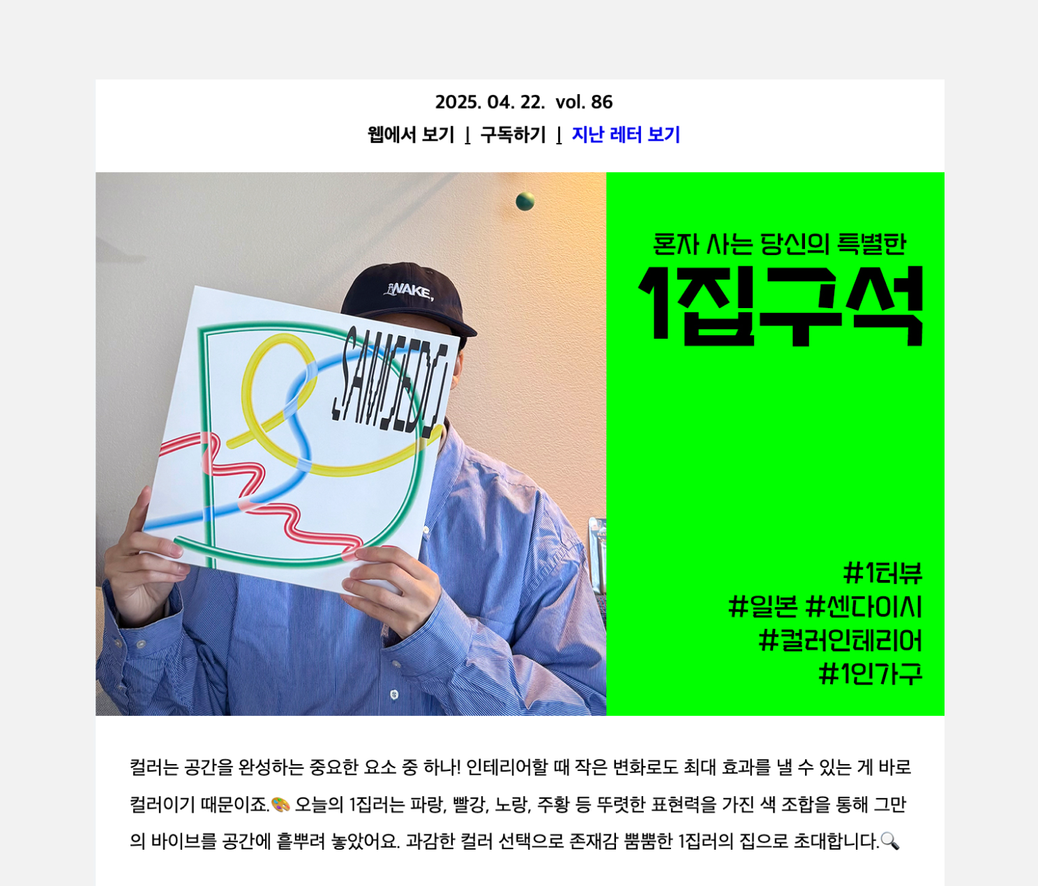 만약 구독자님이 인터뷰 콘텐츠를 기획하고 있다면 <1집구석>을 좋은 레퍼런스로 삼아 보세요. 사람과 공간을 아우르는 질문 구성부터, 본문 곳곳에 URL을 자연스럽게 활용하는 방법, 긴 분량의 인터뷰에 구독자가 더욱 몰입할 수 있도록 돕는 이미지와 영상 배치까지. 내용과 레이아웃 디자인 영역 모두에서 큰 영감을 얻을 수 있을 것입니다.