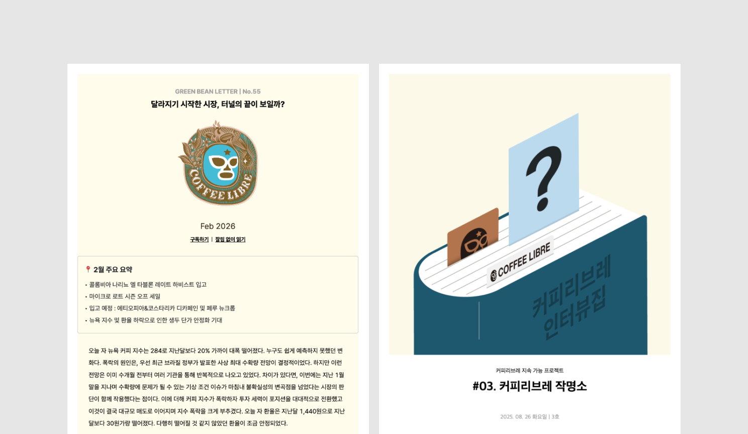 오랫동안 로스터를 위한 B2B 뉴스레터 <생두 뉴스레터>, 프로젝트성으로 인터뷰집 『공전미래』 출간 과정을 담은 B2C 뉴스레터 <커피리브레 지속 가능 프로젝트>, 이렇게 두 개의 뉴스레터를 보내온 커피리브레 팀을 만나보았습니다.