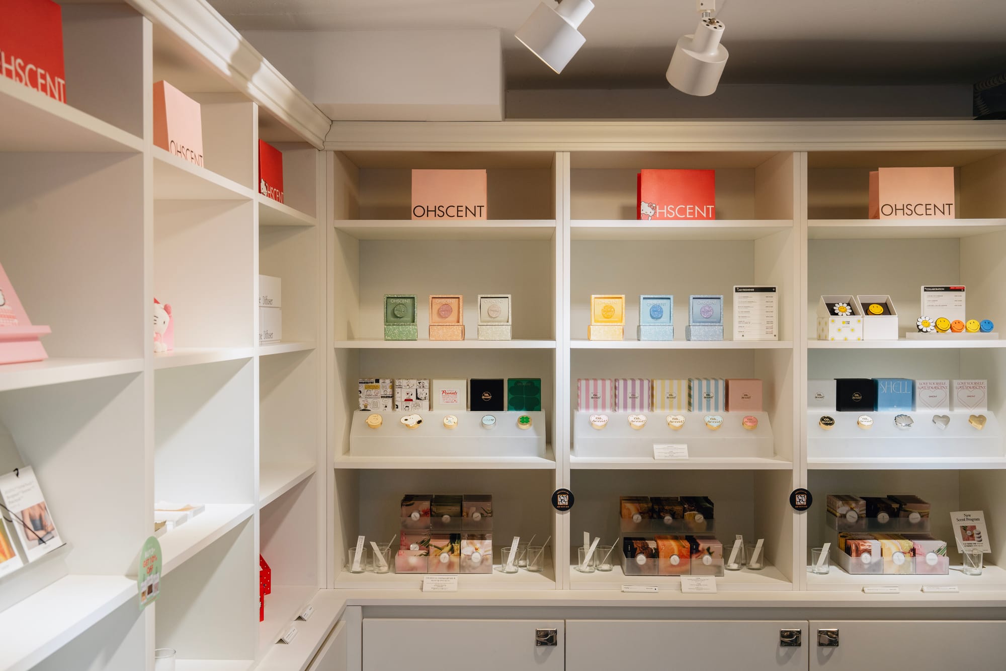 초롱: 오센트는 향만큼이나 디자인에도 꾸준히 공을 들이고 있어요. 매년 4~5종의 새로운 디자인 제품과 협업을 선보이고 있는데, 그 자체로 브랜드의 현재를 보여주는 하나의 언어가 된다고 생각해요. 특히 차량용 방향제는 전면 펜던트를 교체할 수 있는 구조라 브랜드 로고부터 헬로키티, 스마일리 같은 캐릭터까지 그때그때 다른 분위기를 담아낼 수 있어요. 같은 향을 다른 모습으로 느낄 수 있죠.