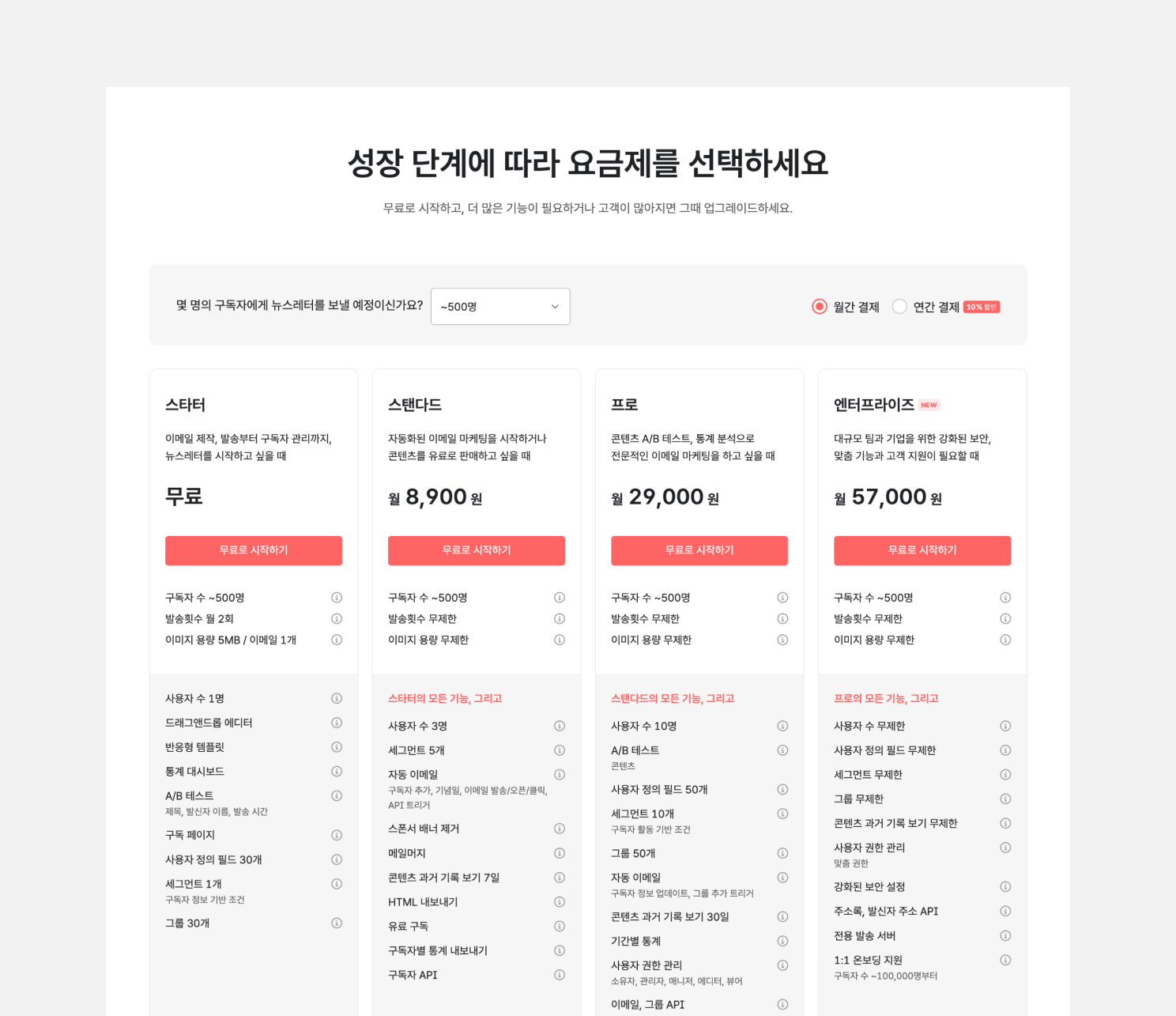 뉴스레터를 꾸준히 보내다 보니 구독자가 500명을 넘었거나 발송 횟수 2회로는 부족하다면, 본격적인 이메일 마케팅을 시작할 시점입니다. 스탠다드 요금제를 고려해 보세요.