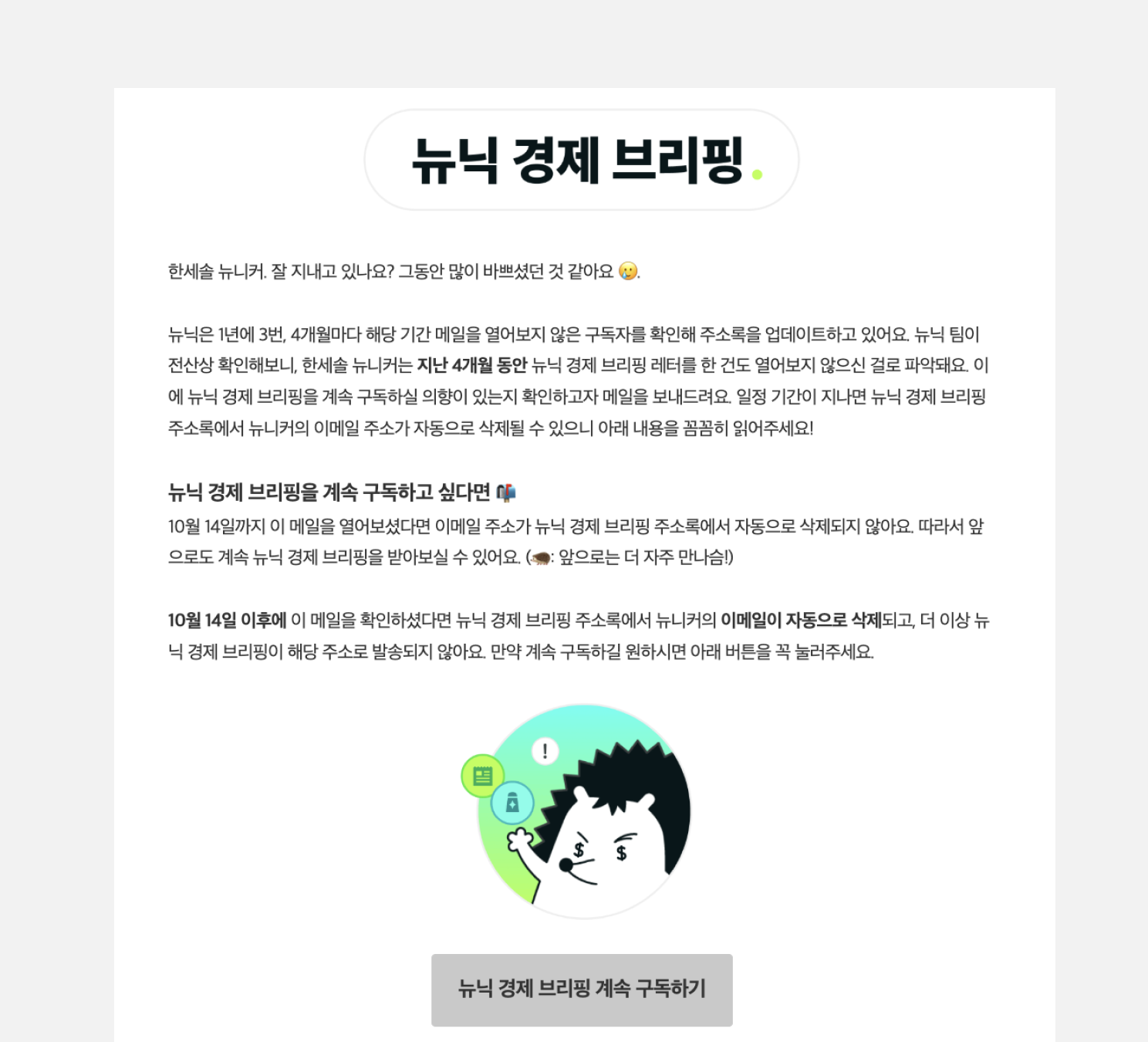 예를 들어, <뉴닉>은 오랫동안 뉴스레터를 오픈하지 않은 휴면 구독자에게 '구독자 뉴니커, 뉴닉 경제 브리핑 잘 받고 있나요?'라는 제목으로 안부를 전하며 뉴스레터를 계속 구독할 의향이 있는지 확인합니다. 이메일 하단에는 뉴스레터 수신을 계속할지 선택할 수 있는 CTA 버튼도 함께 제공합니다.