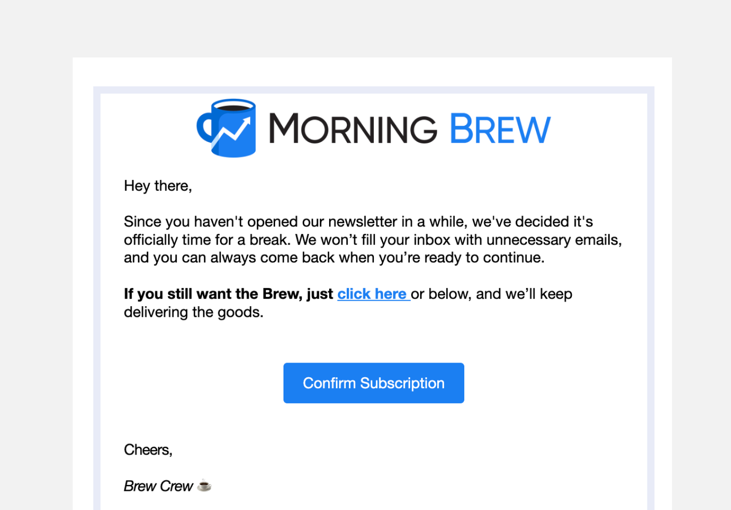 미국의 경제, 테크뉴스레터 <Mornign Brew>는 뉴닉과는 다른 방식으로 휴면 구독자에게 메시지를 보냅니다. 일정 기간 뉴스레터를 읽지 않은 구독자에게 더 이상 메일을 보내지 않겠다고 알리고, 수신을 계속 원한다면 직접 의사를 표시해달라고 요청합니다. 그리고 응답이 없을 경우 주소록에서 구독자를 삭제합니다.