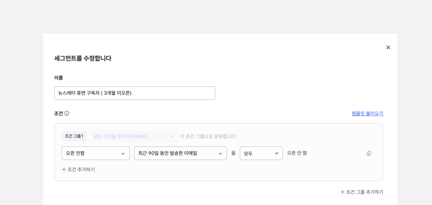 두 뉴스레터의 사례와 같이 휴면 구독자에게 메시지를 보내고 싶다면 스티비의 [세그먼트] 기능을 활용해 보세요. 스티비에서는 세그먼트 기능을 활용해 장기 미오픈 구독자를 추출하고, 이들을 대상으로 리마인드 이메일을 보낼 수 있습니다. 주소록의 [세그먼트]에서 조건을 [구독자 활동 > 오픈 안 함]으로 설정한 뒤, 기간을 지정하면 됩니다.