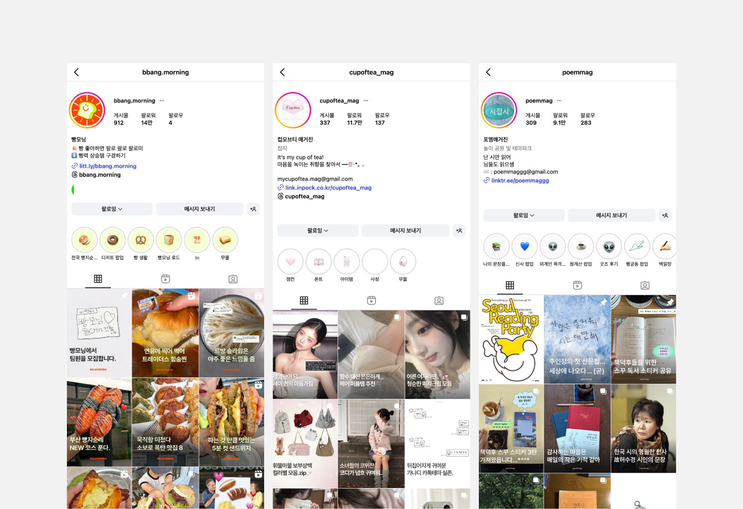 기존 잡지와 다르게 누구나 쉽게 만들고 운영할 수 있다는 점에서 보다 자유로운 주제를 다루는 매거진도 등장하고 있는데요. 예를 들면 빵을 주제로 하는 빵모닝(@bbang.morning), 폰꾸미기를 다루는 컵오브티(@cupoftea_mag), 시를 주제로 하는 포엠매거진(@poemmag) 등이 그 예입니다.