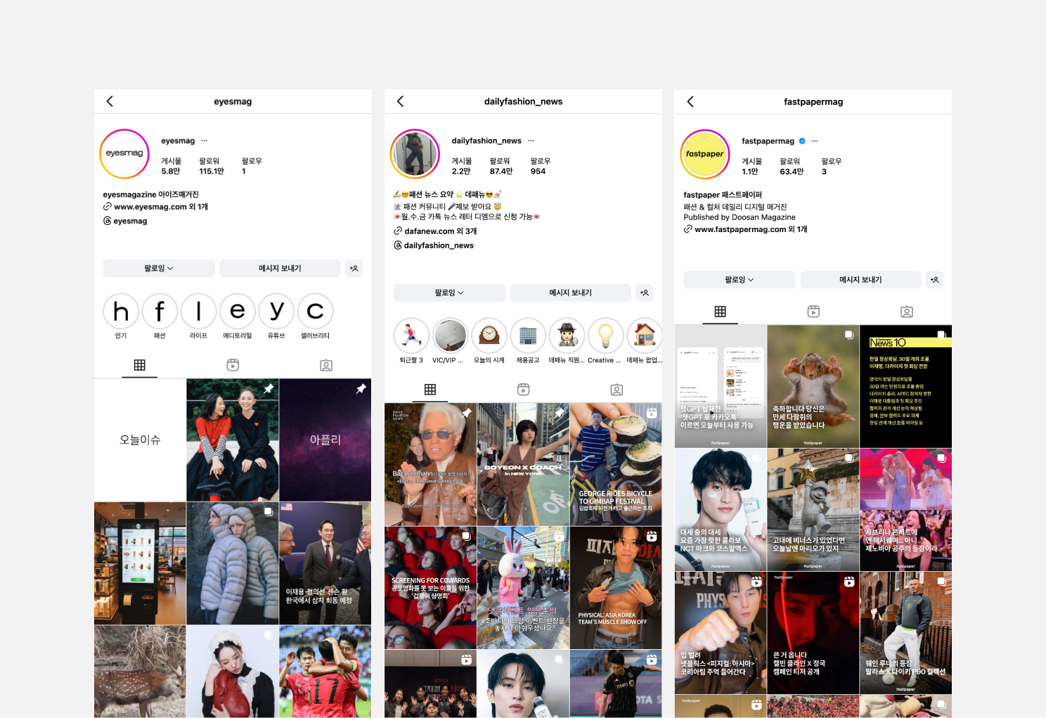 하나의 주제를 깊이 있게 다루는 계정도 점점 늘고 있습니다. '인스타 매거진'이라는 고유한 스타일도 등장했습니다. 인스타 매거진이란, 여러 이미지를 한 호의 잡지처럼 구성해 표지와 함께 텍스트 기반으로 정보를 전하는 것인데요. 대표적인 인스타 매거진으로는 패션, 리빙 분야의 아이즈매거진(@eyesmag), 데패뉴(@dailyfashion_news), 패스트페이퍼(@fastpapermag) 등을 꼽을 수 있습니다.