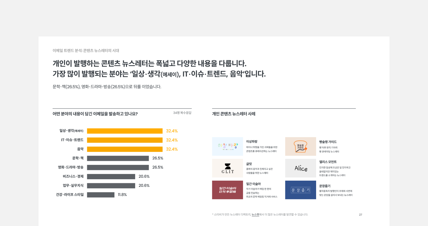 이미 몇 년 전, '스티비 2021 이메일 마케팅 리포트'에서는 이를 '콘텐츠 뉴스레터의 시대'라고 정의하며, 개인 크리에이터들이 왜 이메일이라는 형식에 주목하고 있으며 직접 뉴스레터를 발행하는지에 대한 흐름을 분석하기도 했습니다.