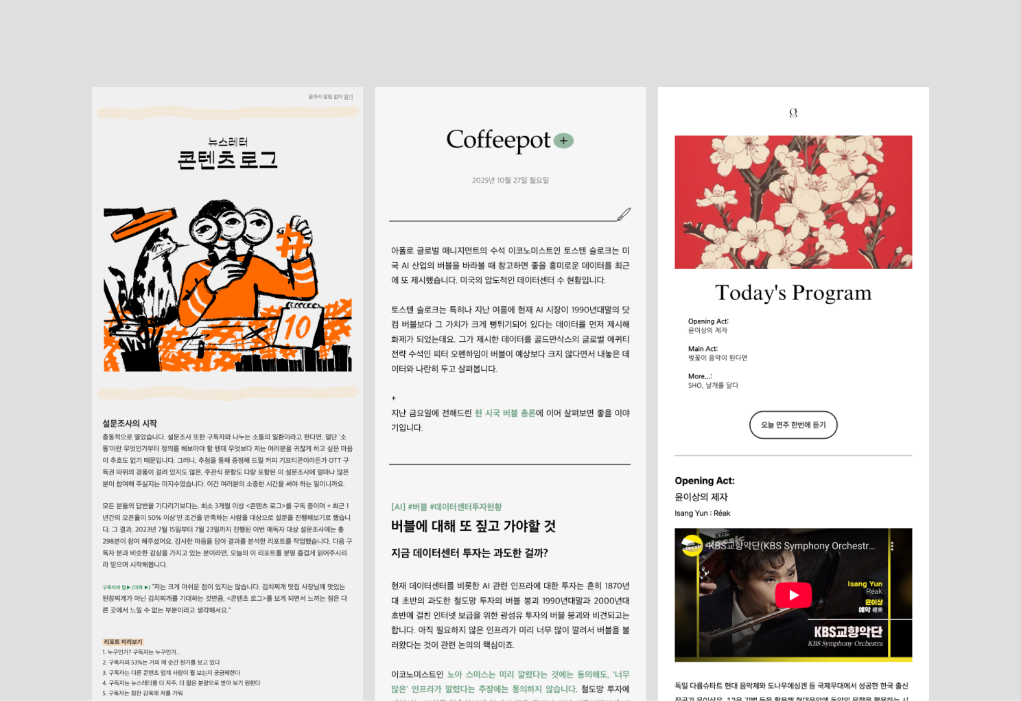 이메일은 오래된 커뮤니케이션 수단이지만, 개인 크리에이터들의 뉴스레터 발행으로 계속 새로운 주제와 형식의 이메일 뉴스레터가 등장하면서 꾸준히 사용되고 있는데요. 별도로 배우지 않아도 사용할 수 있는 익숙한 채널이고, 자신의 콘텐츠를 자유롭게 발행할 수 있으며, 구독자에게 직접 전달하며 관계를 맺을 수 있어 많은 개인 크리에이터들이 뉴스레터를 선택하고 있습니다.
