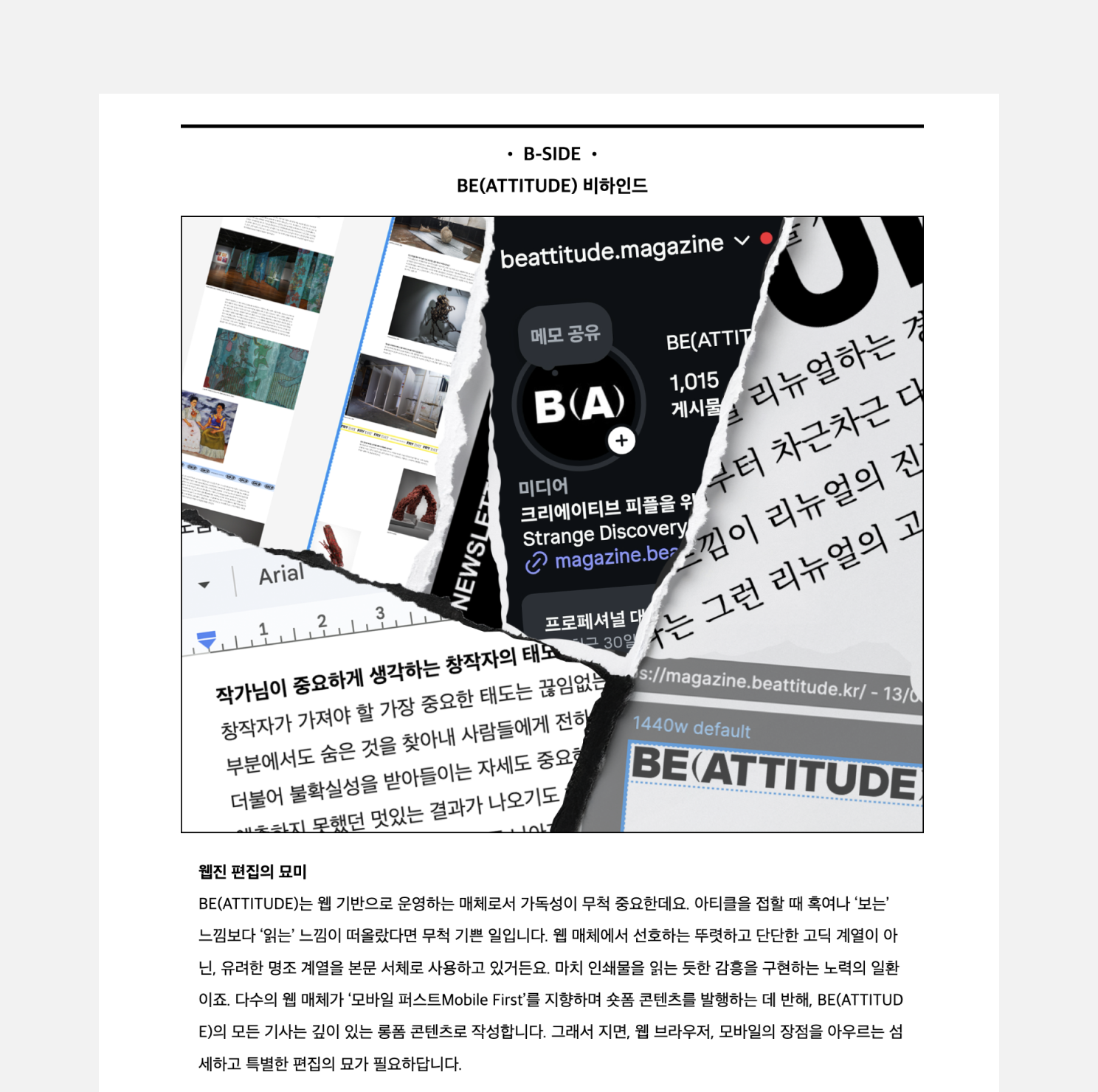 아티스틱 라이프스타일을 지향하는 <BE(ATTITUDE)>는 뉴스레터에서 'Behind' 코너를 운영하며 브랜드의 이야기를 더욱 자세히 전합니다. 7월 뉴스레터에서는 롱폼 콘텐츠로 발행하는 웹진 편집의 묘미에 대해서 이야기하며 추구하는 콘텐츠 지향성을 전달하기도 했습니다. 인스타그램의 팔로우가 '우연히 볼 확률을 높이는 선택'이라면, 뉴스레터 구독은 '놓치지 않겠다는 선택'으로 보다 적극적입니다. 듣고자 준비된 팬들에게 브랜드의 진짜 이야기를 들려주세요.