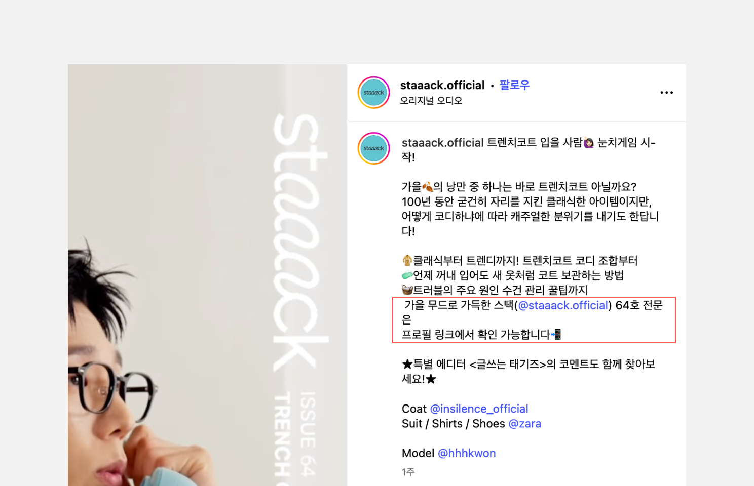 패션에 대해 이야기하는 <스택>은 '트렌치코트'를 주제로, 인스타그램에는 팔로워들의 관심을 이끌 릴스를 업로드하고 자세한 정보는 뉴스레터로 풀어냈습니다. 구독은 인스타그램 프로필 링크를 활용했죠. 뉴스레터에는 트렌치코트의 어원부터 여러 종류, 인플루언서의 스타일링 팁 및 세탁, 관리 방법까지 자세하게 적혀있습니다.