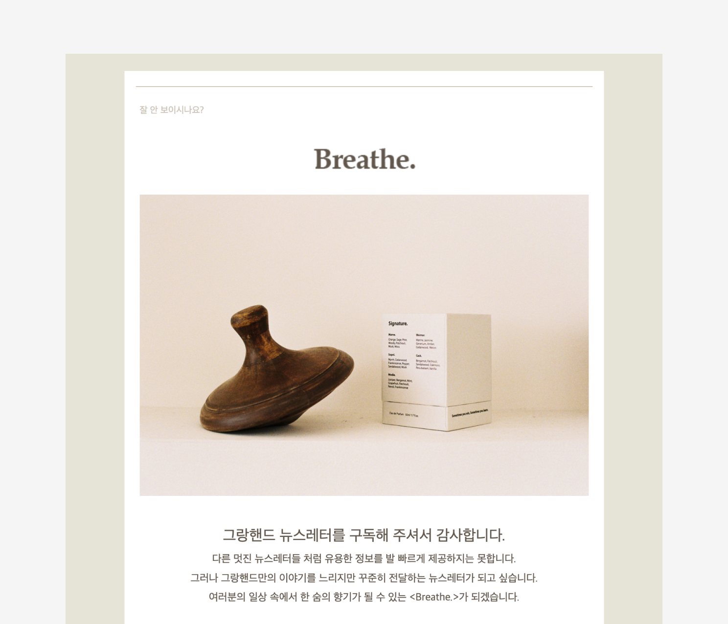 그랑핸드는 이러한 <Breathe.> 뉴스레터의 특성을 웰컴 이메일을 통해 설명합니다. 구독자가 새로운 뉴스레터를 구독한 직후에는 자신이 구독한 뉴스레터가 어떤 내용인지, 어떤 콘셉트를 가지고 발행되는지 알기 어려운데요. 그랑핸드는 웰컴 이메일을 활용해 <Breathe.>를 조금 더 자세히 설명하는데 집중한 것이죠. 그리고 <Breathe.> 뉴스레터가 더 궁금한 구독자를 위해 ‘지난 뉴스레터 보기'링크를 삽입해 두었고요.