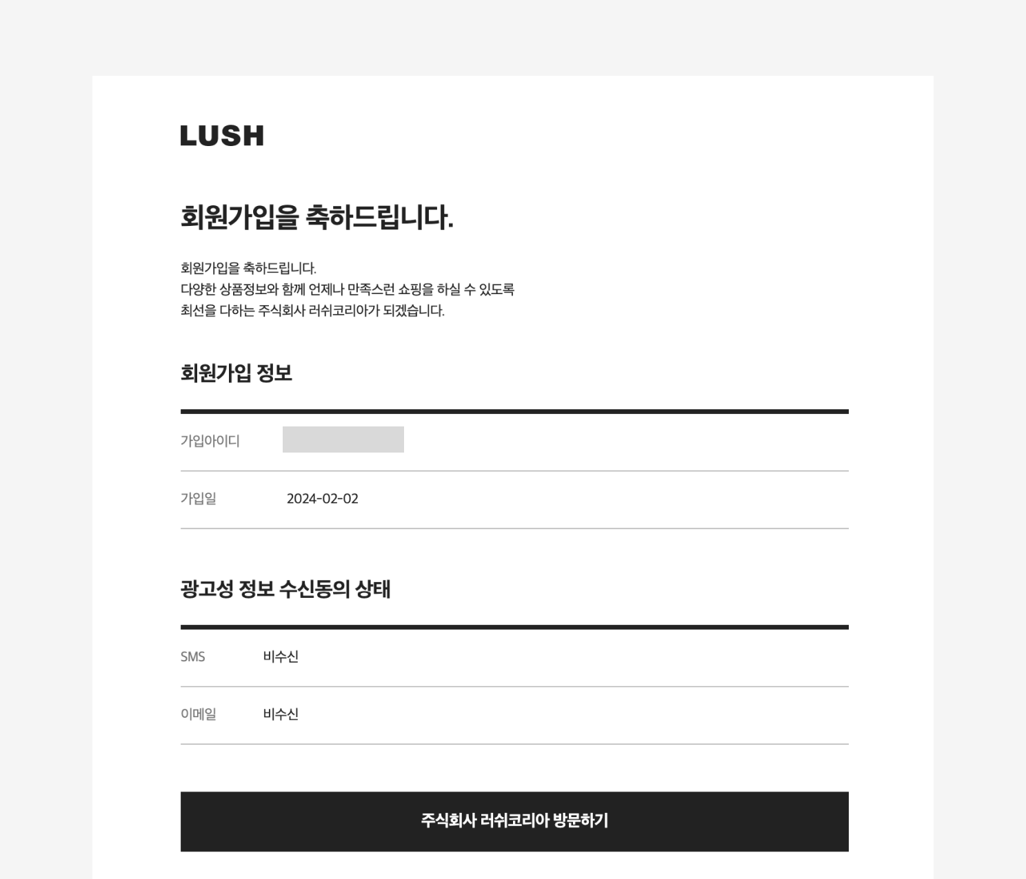 - 웰컴 이메일 제목: [주식회사 러쉬코리아] 회원가입을 축하드립니다.