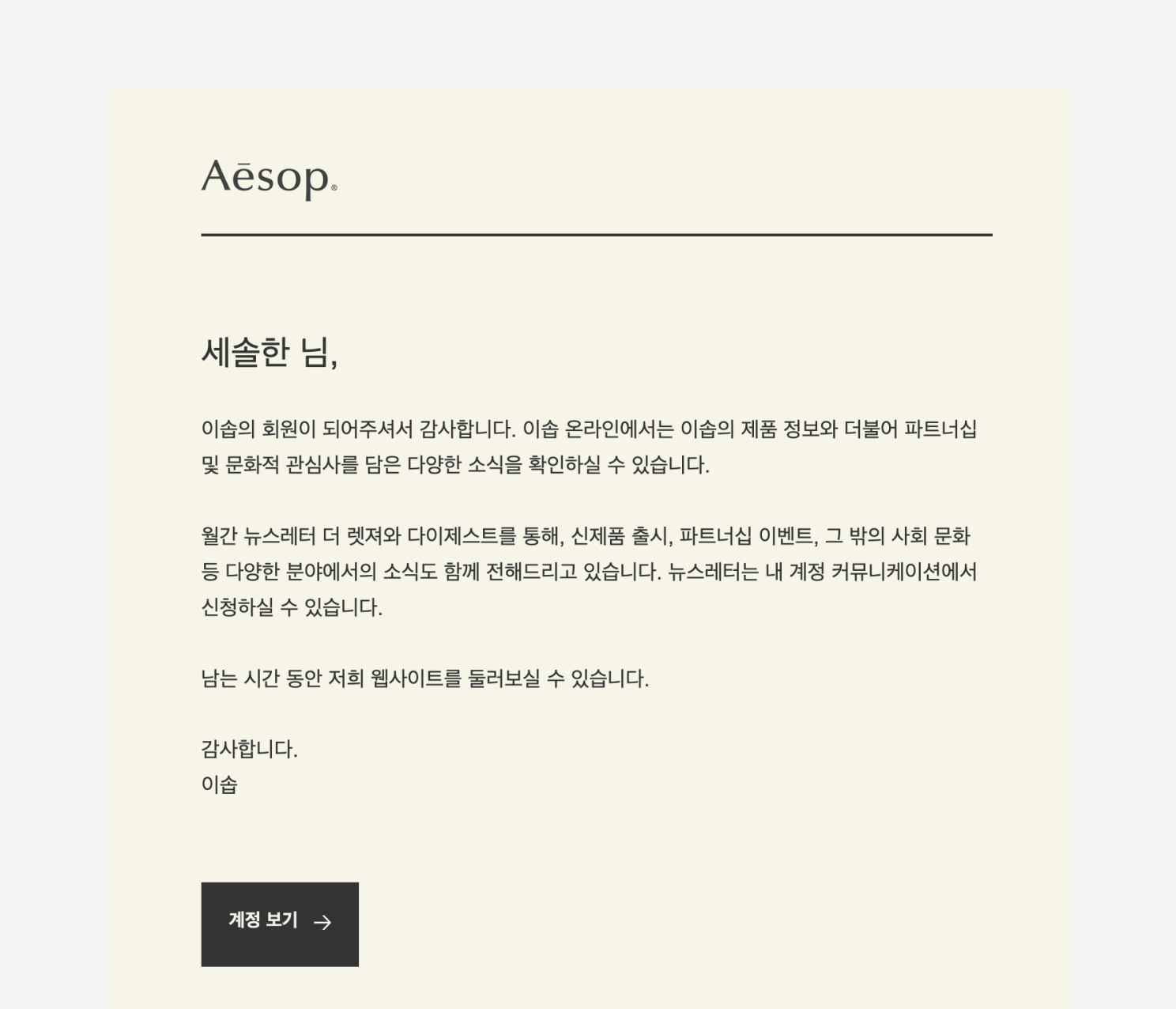 이솝은 웰컴 이메일을 통해 이솝의 제품, 오리지널 콘텐츠, 새로운 소식 등 웹사이트를 구성하고 있는 다채로운 내용을 소개합니다. 그리고 이후 뉴스레터를 통해 받을 수 있는 콘텐츠를 소개하며 기대감을 높이는데요. 이때 회원가입 시 마케팅 정보 수신동의를 놓친 고객을 위해 뉴스레터를 구독할 수 있는 방법을 소개합니다. 더 많은 고객들과 이메일로 소통할 수 있도록 간단하지만 친절한 가이드를 전하는 것이죠.