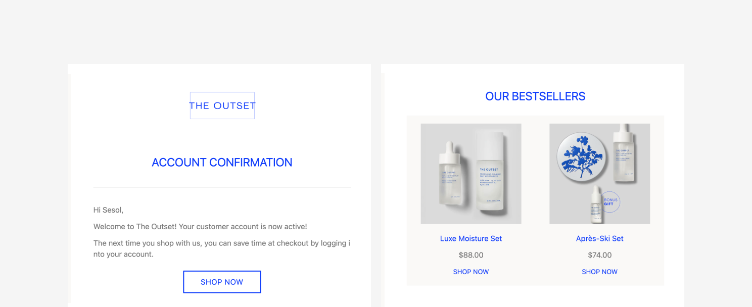 The Outset의 웰컴 이메일은 회원가입 후 계정이 활성화되었으며, 이후 웹사이트에서 쇼핑을 하게 되면 해당 계정을 활용해 결제 과정에서의 시간을 단축시킬 수 있다는 친절한 안내를 전합니다. 그리고 ‘지금 쇼핑하기' CTA와 베스트셀러 두 개 제품을 안내하는 코너를 통해 회원 가입 후 신규 고객이 조금 더 쉽게 첫 구매를 진행할 수 있도록 돕고 있고요.