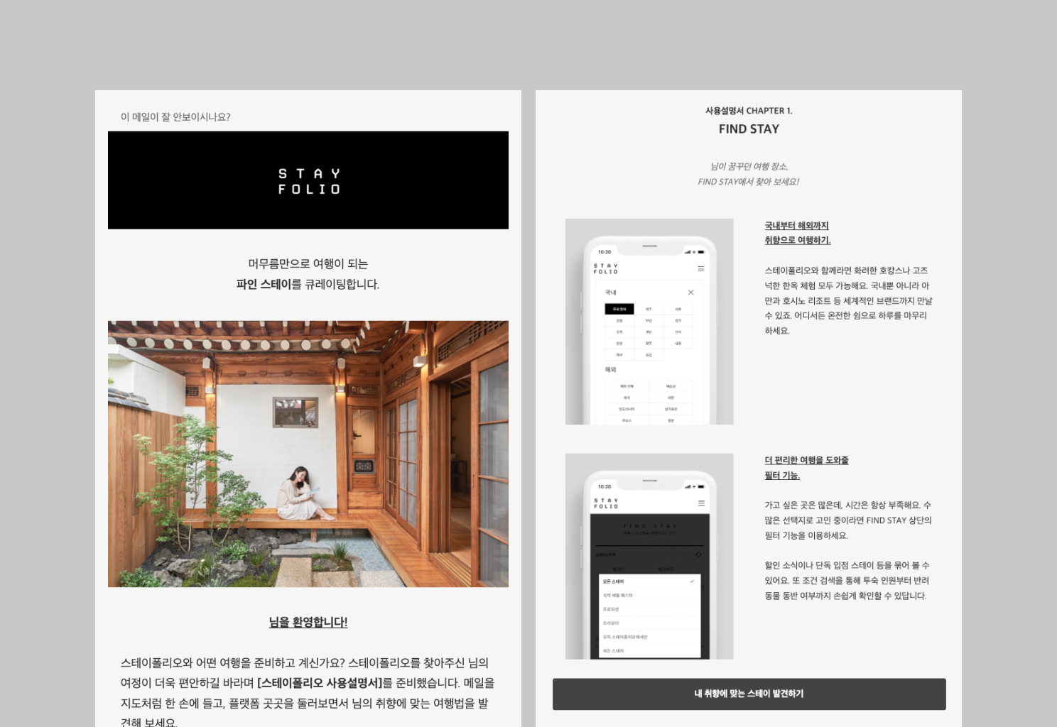 스테이폴리오의 웰컴 이메일은 스테이폴리오를 처음 알게 된 사람도 서비스를 이해하고 사용할 수 있도록 자세하게 설명합니다. 다섯 가지 챕터로 구성하여 취향에 맞는 스테이를 발견하는 방법부터 프로모션, 저널, 프리오더 혜택 및 멤버십 혜택까지 하나씩 자세히 안내합니다. 웰컴 이메일을 읽은 고객에게 플랫폼 곳곳을 하나씩 살펴볼 수 있는 가이드 역할을 해줄 뿐만 아니라 고객의 첫 구매를 만드는데도 기여하고 있습니다.