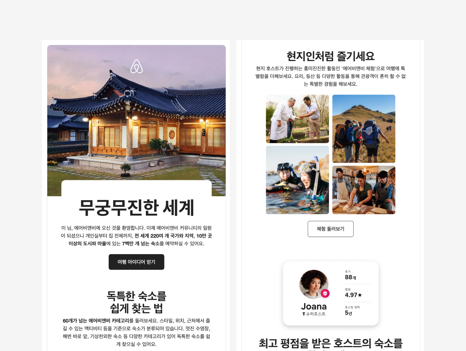 에어비앤비는 고객들에게 다양한 서비스를 제공하는 만큼, 웰컴 이메일에서도 에어비앤비에서 경험할 수 있는 여러 숙소와 체험을 소개하기 위해 gif를 활용합니다. 덕분에 jpg, png 확장자의 이미지를 사용할 때보다 더 다양한 이미지를 손쉽게 보여주면서도, 이메일이 살아있다는 생동감을 주는 효과를 얻을 수 있었습니다.