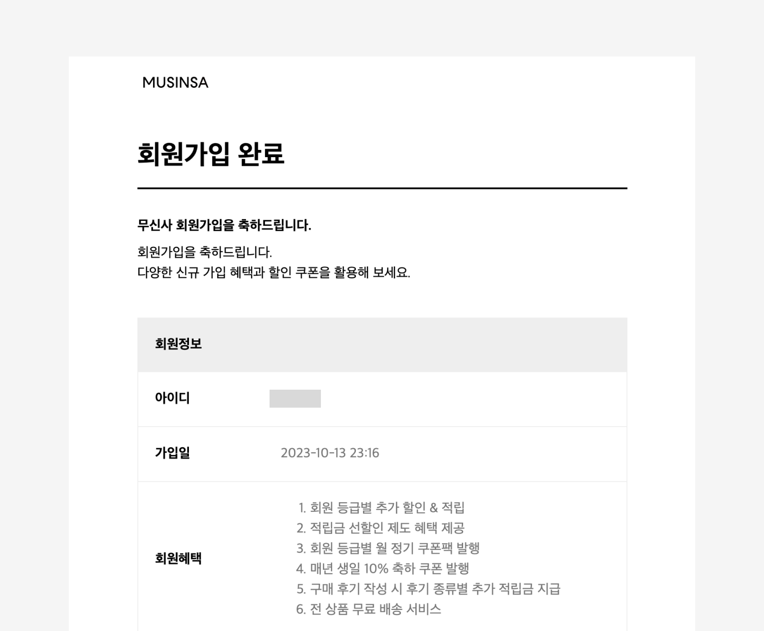 - 웰컴 이메일 제목: [무신사] 회원가입을 축하드립니다