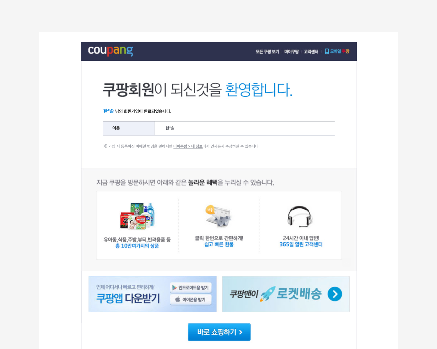 - 웰컴 이메일 제목: [쿠팡] 회원가입을 환영합니다!