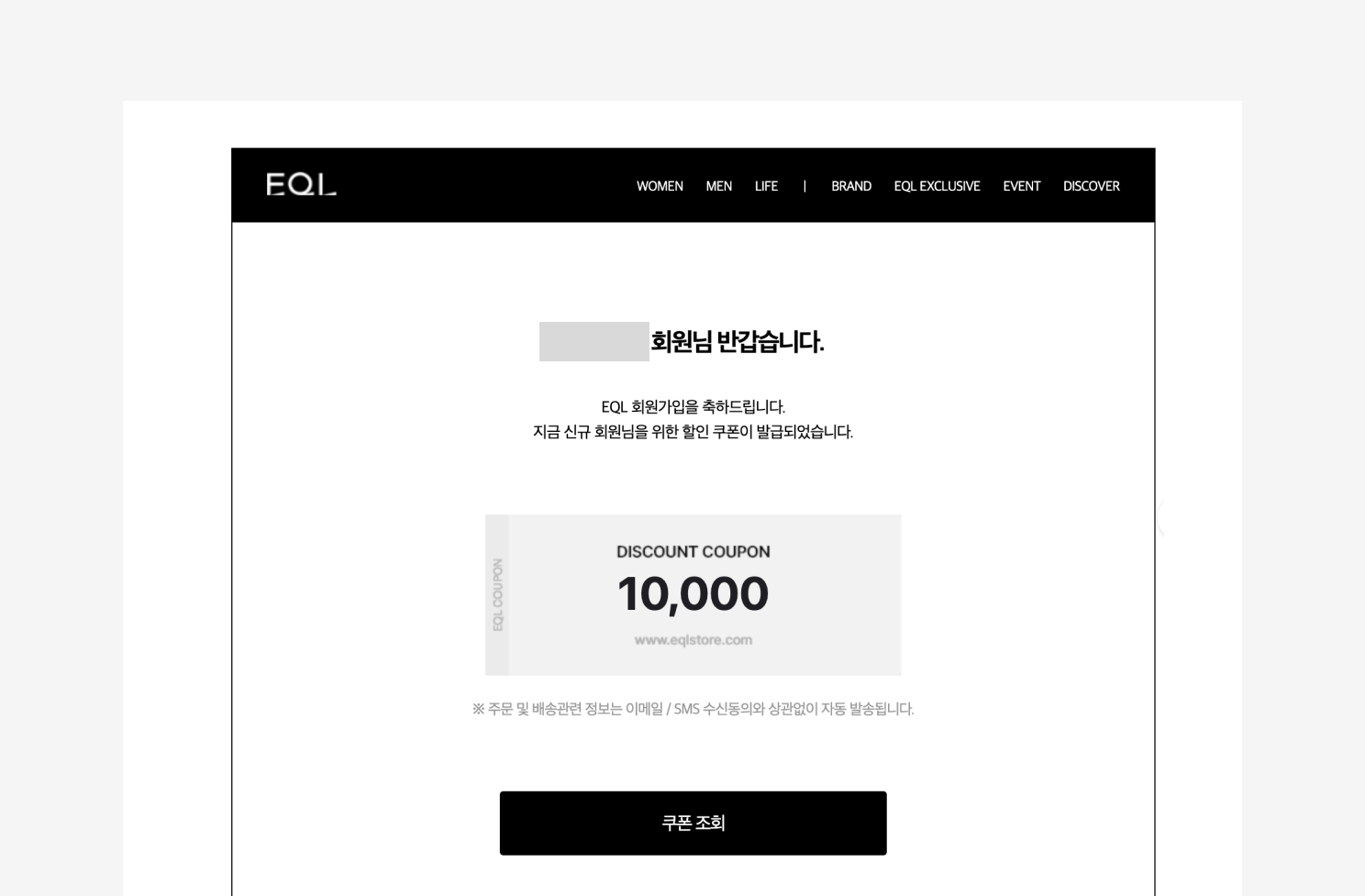 EQL은 신규 가입한 고객에게 웰컴 이메일을 통해 환영의 메시지를 전하는데요. 이때 이메일 제목과 본문 모두에서 메일머지를 활용해 고객의 이름을 직접 불러주고 있습니다. EQL은 가입 혜택으로 10,000원 할인 쿠폰을 제공합니다. 이때 쿠폰 이미지를 활용해 고객이 쿠폰 혜택을 더욱 직관적으로 느낄 수 있도록 돕고 있습니다. 또 하단에 쿠폰 조회 CTA를 배치해 발급된 쿠폰을 확인함과 동시에 EQL 쇼핑몰에 한 번 더 들러 상품을 구경하거나 더 나아가 구매를 할 수 있는 계기를 만들고 있고요.